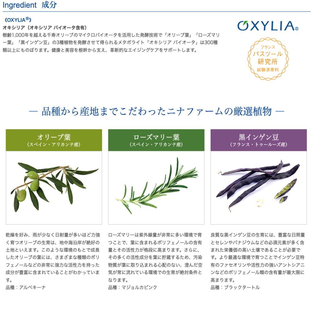 OX-288には独自成分オキシリア(オキシリア バイオータ含有)を配合。樹齢1,000年を越える千寿オリーブのマイクロバイオータ(微生物)を活用した発酵技術で「オリーブ葉」「ローズマリー葉」「黒インゲン豆」の3種植物を発酵させて得たメタボライト(代謝産物)は相乗効果を持って働き、優れたパフォーマンスを可能にします。いつまでも若々しくすこやかな毎日を目指す、新たなエイジングケアアプローチがあなたの未来をサポートします。