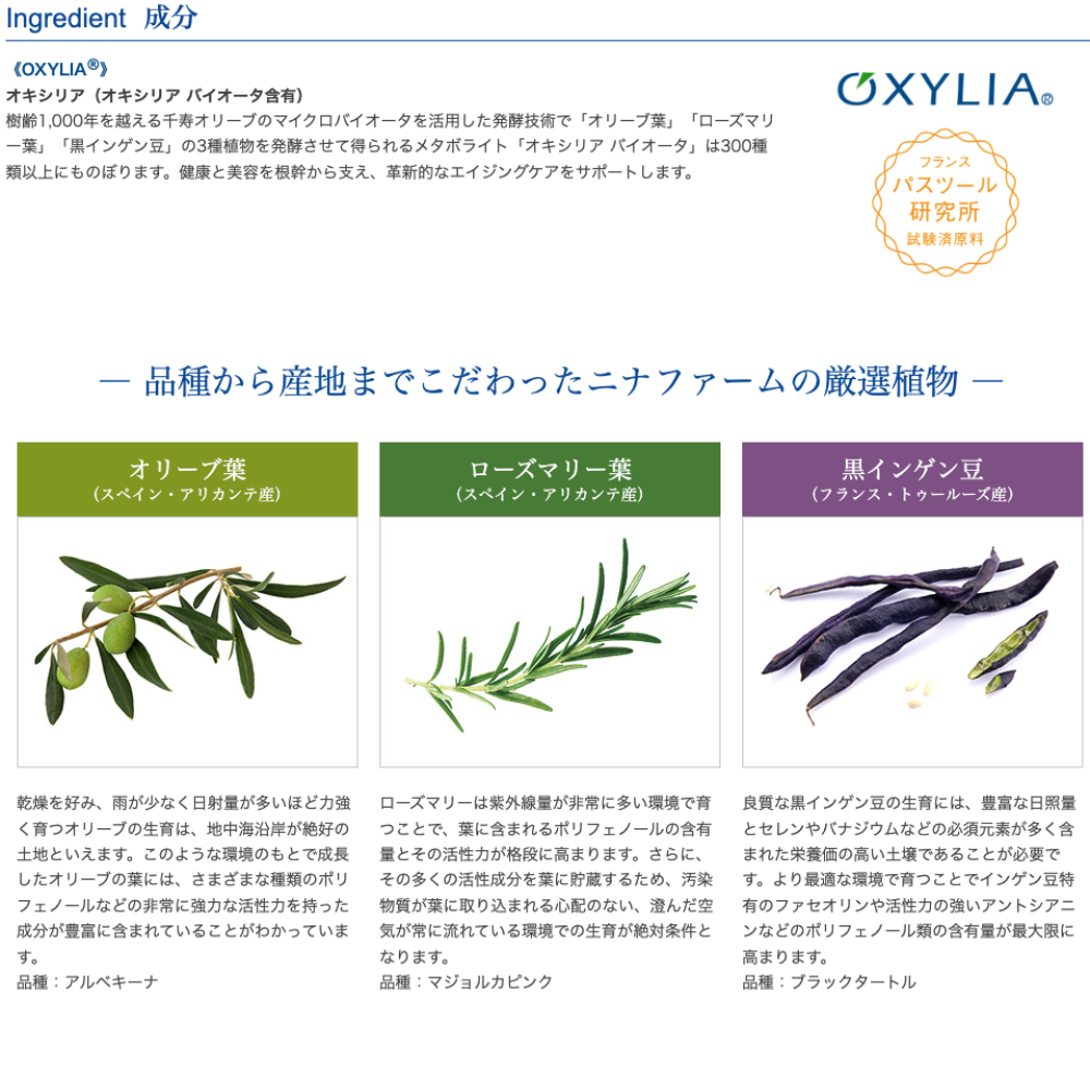 ニナファームは健康で長生きな百寿者の研究成果において強力で多様性に満ちたマイクロバイオータ(微生物)と、それらが発酵の最終過程でつくり出すさまざまな種類のメタボライトが、身体の内側から健康を支える重要な役割を担っていることを発見しました。OX-288には独自成分オキシリア(オキシリア バイオータ含有)を配合。樹齢1,000年を超える千寿オリーブのマイクロバイオータを活用した発酵技術で「オリーブ葉」「ローズマリー葉」「黒インゲン豆」の3種植物を発酵させて得たメタボライトは相乗効果を持って働き、優れたパフォーマンスを可能にします。いつまでも若々しくすこやかな毎日を目指す、新たなエイジングケアアプローチがあなたの未来をサポートします。 のどごしなめらかで食べやすいOX-288のゼリータイプ(青りんご味)。スティック状の個包装で携帯しやすく、いつでも気軽にすこやかな毎日をサポートします。