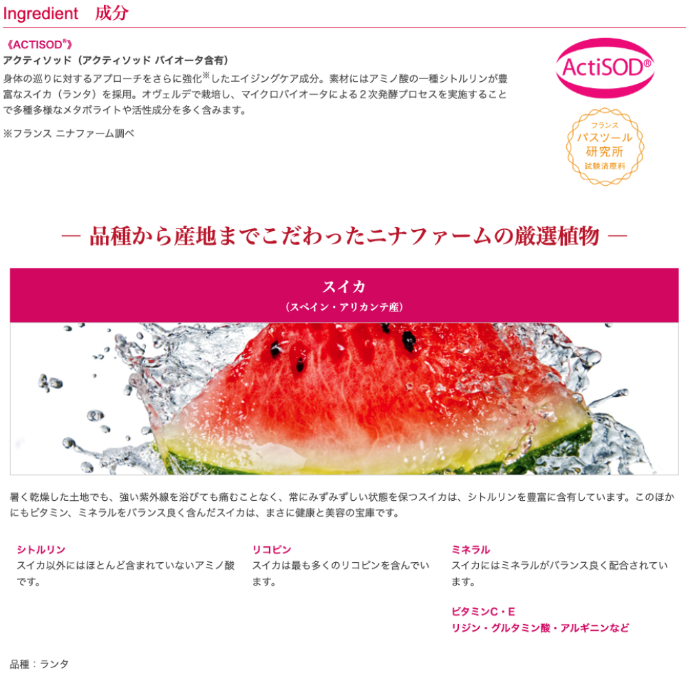 原材料:還元麦芽糖水飴(国内製造)・デキストリン・コラーゲンペプチド(ゼラチンを含む)・スイカ果実エキス/ベニコウジ色素・クエン酸・香料・リン酸三カルシウム・ビタミンB1・ビタミンB6・ビタミンB2
