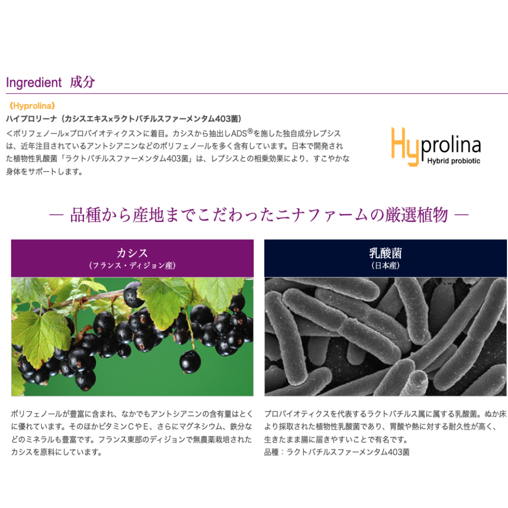 腸内環境に着目したカプセルタイプのサプリメント。アントシアニンなどのポリフェノールを豊富に含むカシス由来成分レプシス(ADS®)に、日本で開発した植物性乳酸菌ラクトバチルスファーメンタム403菌をコンプレックスした独自成分ハイプロリーナを配合。さらに、サポート成分としてブドウの若芽から抽出したレスベラトロールや亜鉛、セレン、クロムもバランス良く配合しました。内側からのリズムを整え、健康と美容をサポートします。