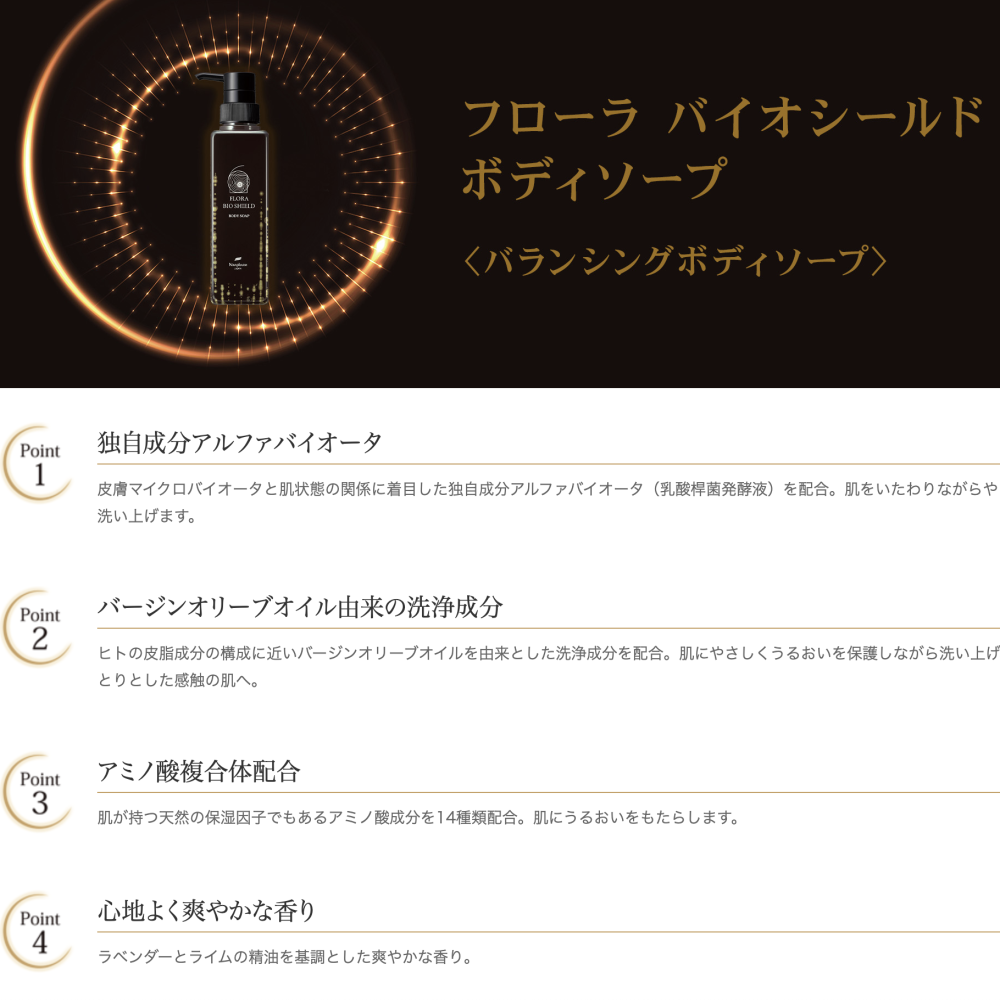 肌状態と肌に生息する皮膚マイクロバイオータの関係に着目し生まれたバランシングボディソープ。 バージンオリーブオイル由来の保湿力が高い洗浄成分や、しっとりとしたうるおい感をもたらす14種のアミノ酸成分配合。シールド効果で肌を保護しながら洗って整えます。 ラベンダーとライムを基調とした精油コンプレックスの爽やかな香り。