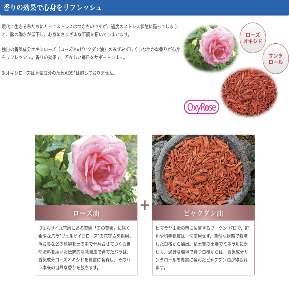 美しい庭園に咲くバラのように、みずみずしくしなやかな香り。ローズ油×ビャクダン油の独自成分オキシローズを採用。